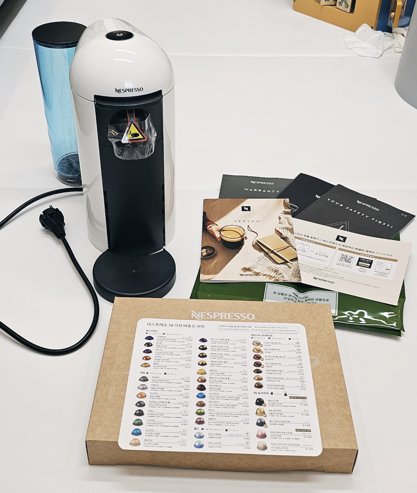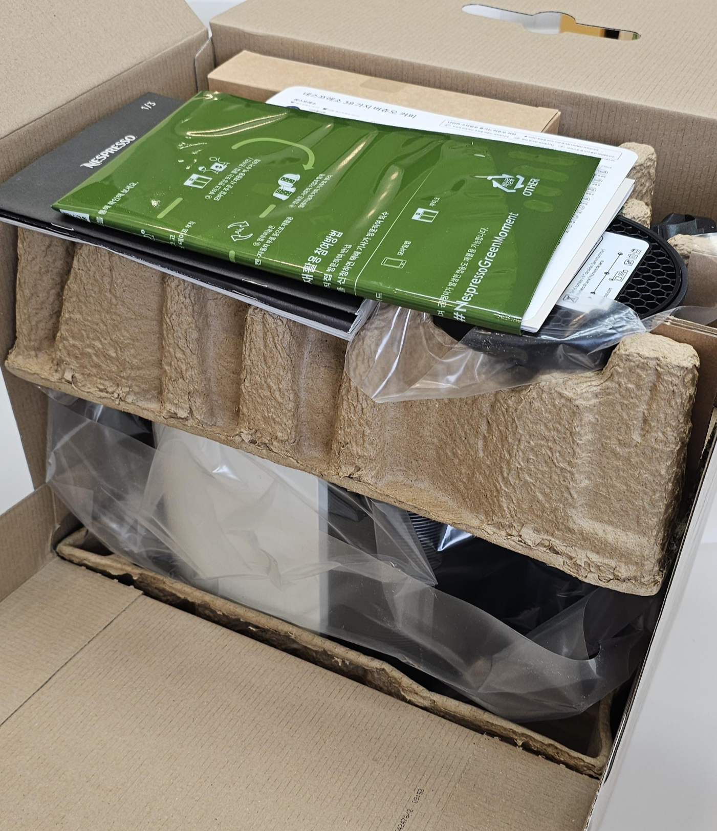 본체와 각종 사용설명서 + 캡슐 회수백 + 웰컴 기프트(커피 캡슐 12개)가 들어 있었다.