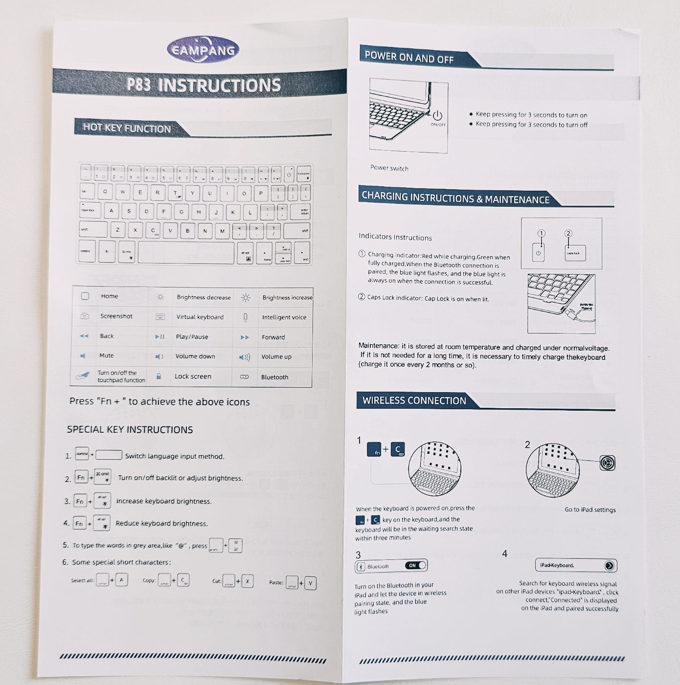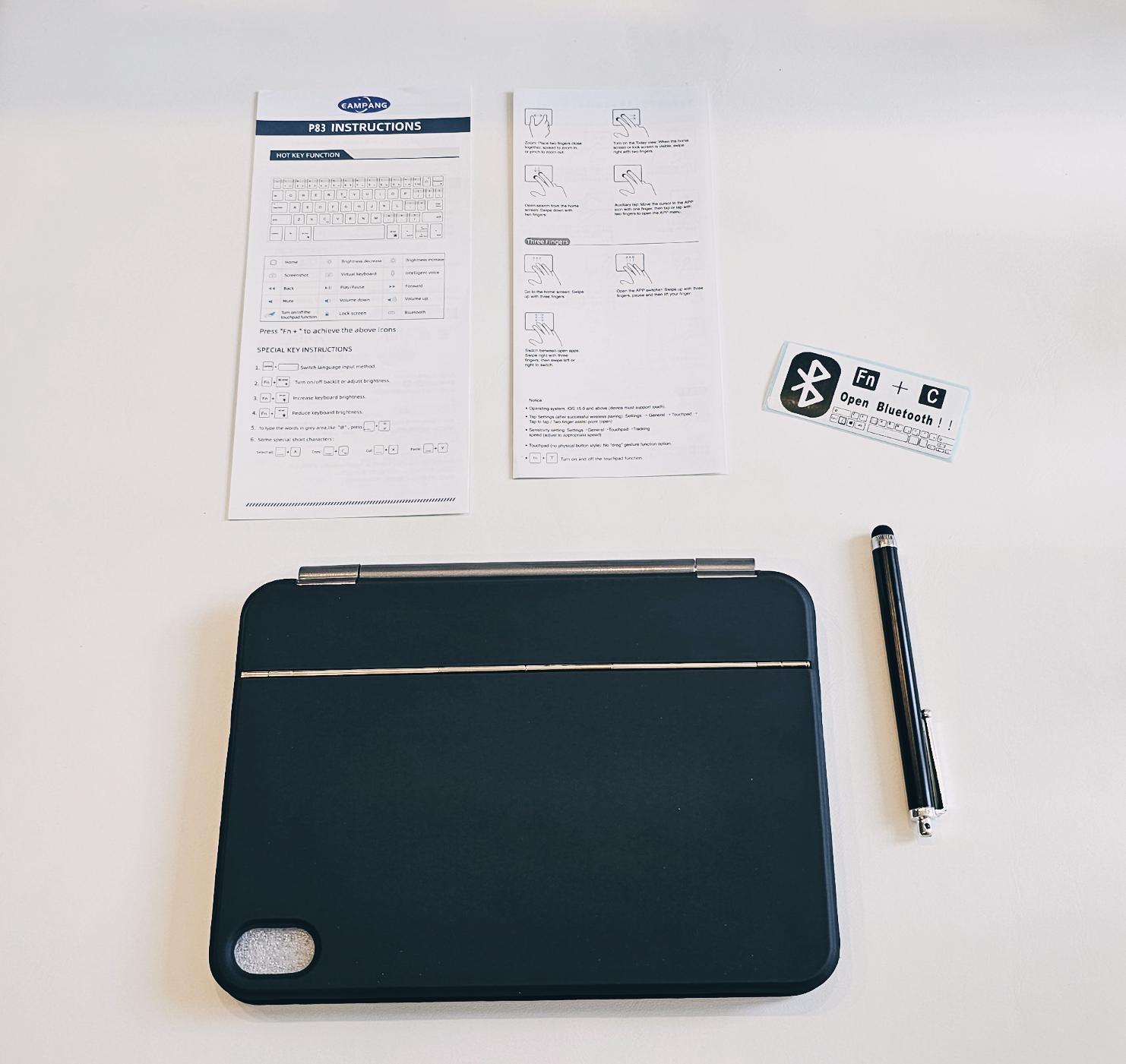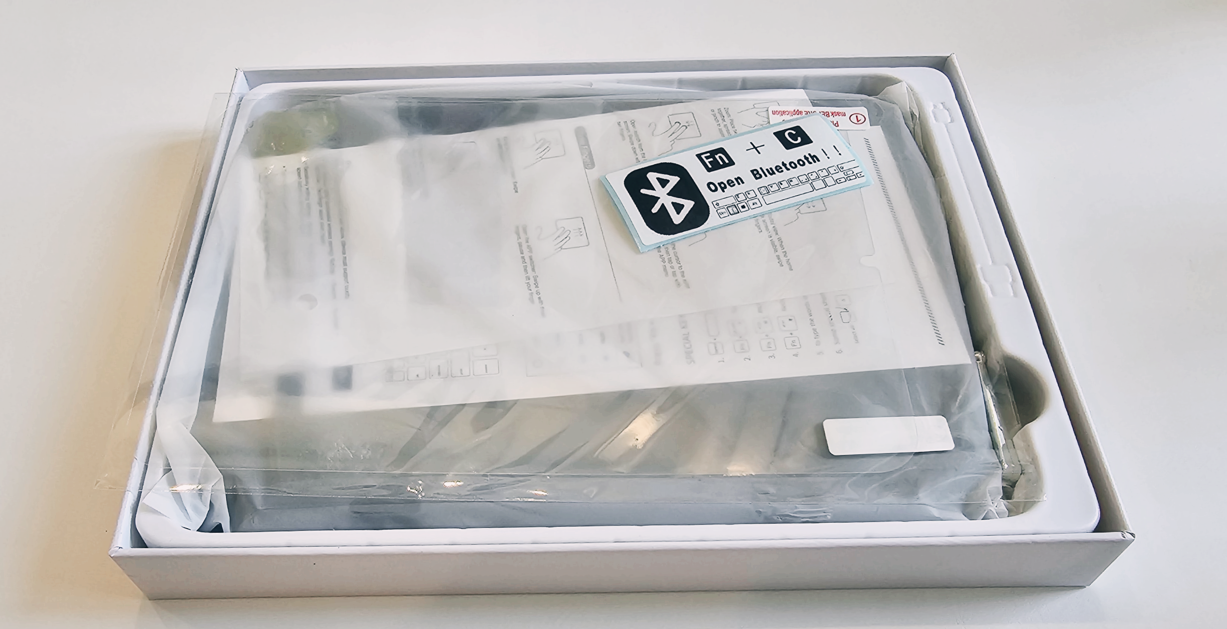 키보드와 패드를 연결하는 블루투스 키 버튼은 펑션키와 C를 눌러야 한다고 쓰여져 있는 스티커가 동봉되어 있었어요.