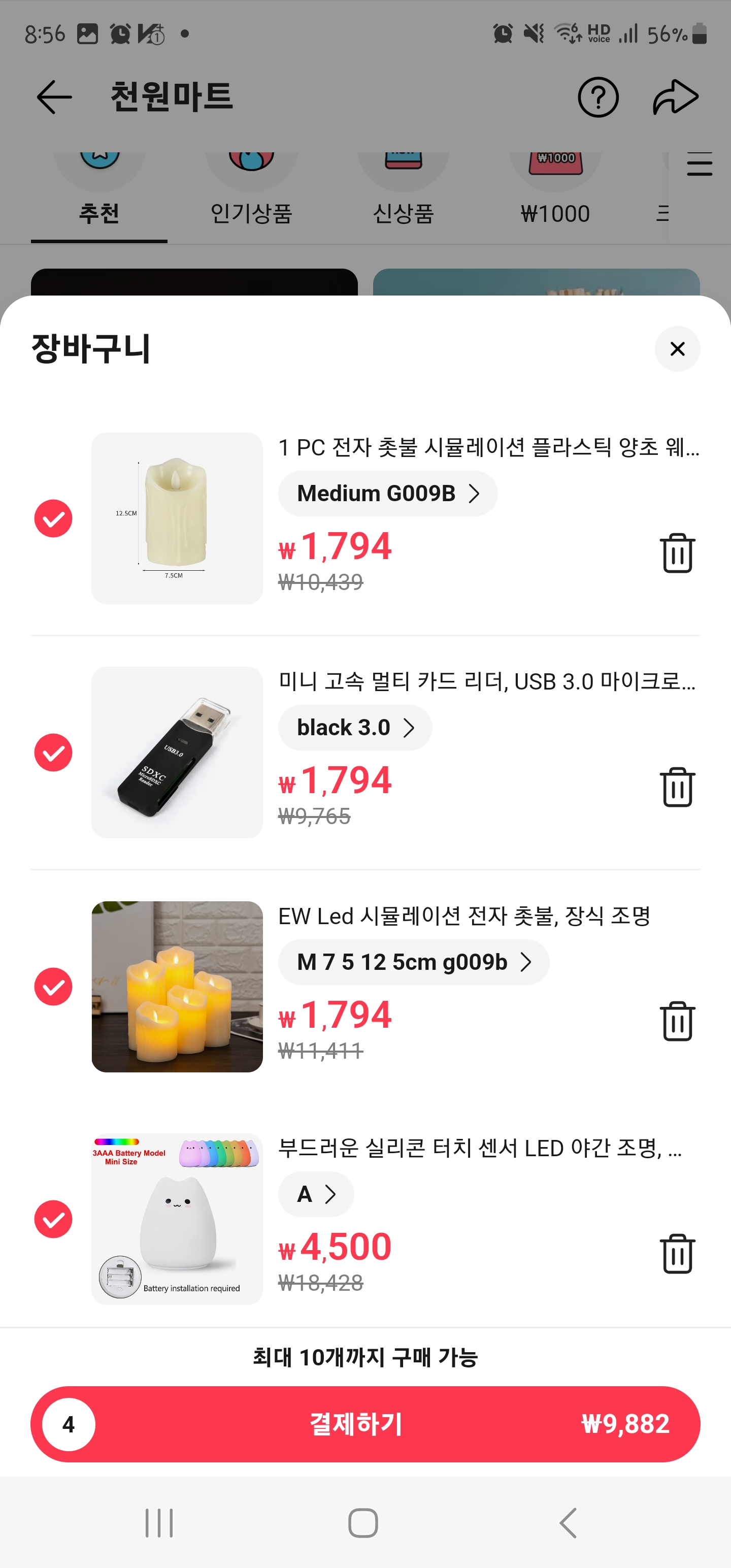 다만, 천원마트 상품은 총 10개까지만 담을 수 있고,