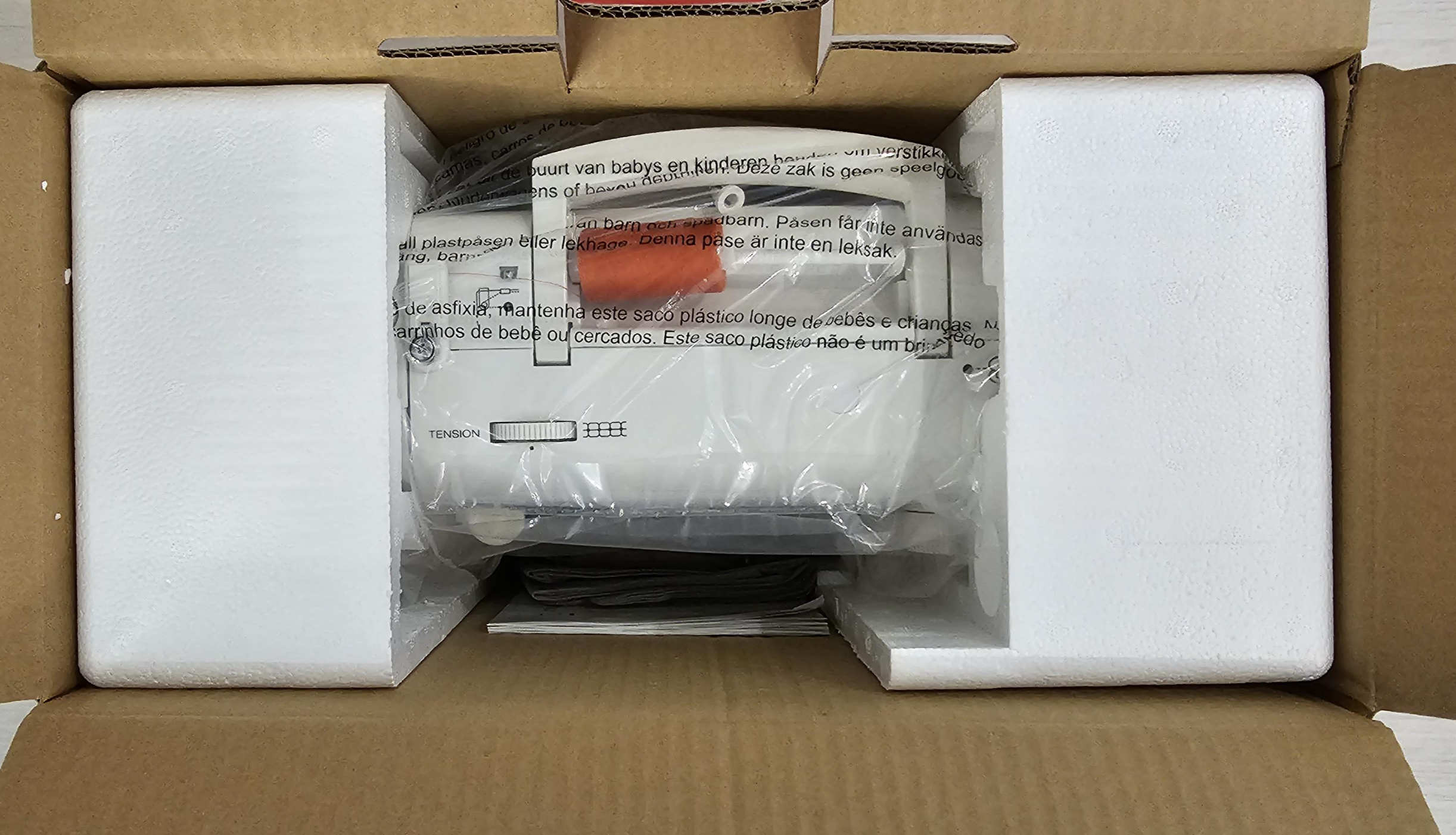 본체, 사용설명서, 기본 부속품 꾸러미, 커버, 발판 등이 들어 있는 모습.