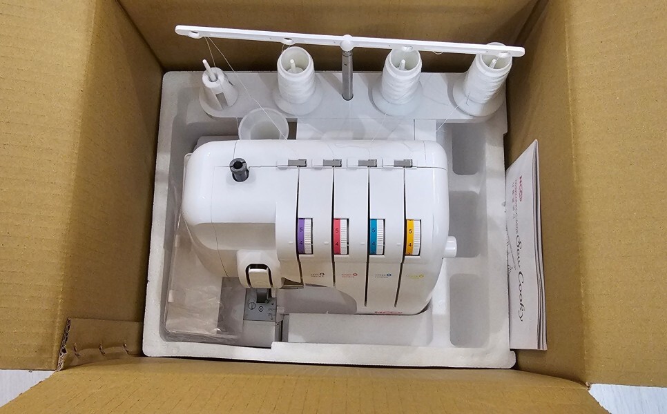 추가 사은품으로는 오버록 교재와 미싱 실, 파우치, 테스트 천 등이 왔음.