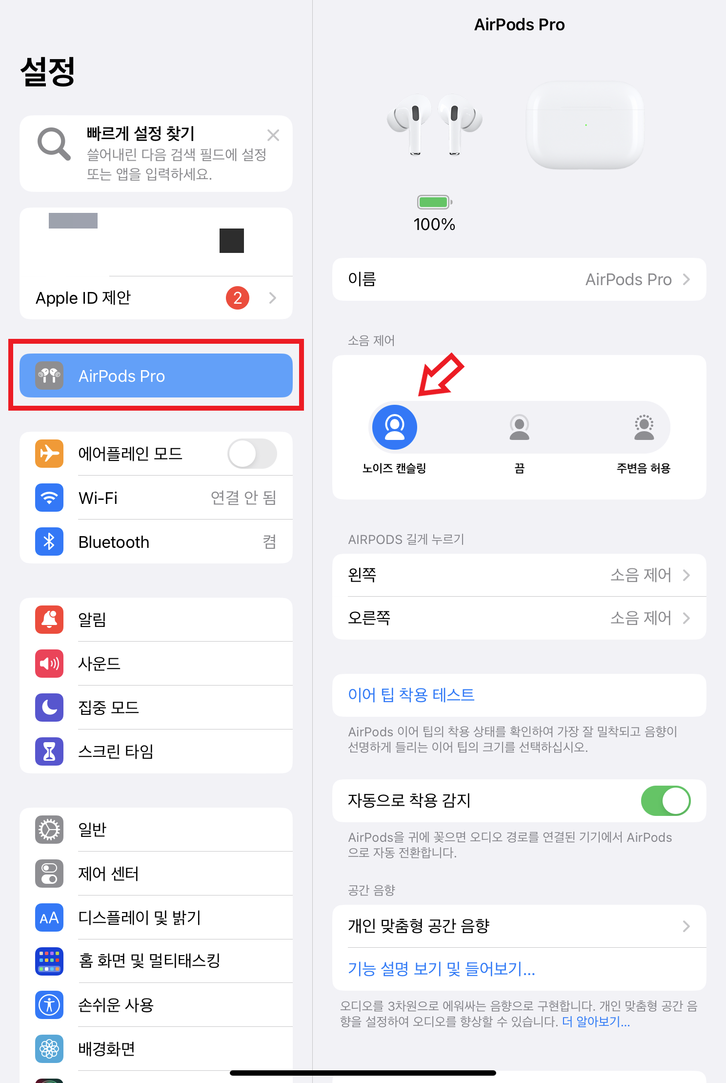 노이즈 캔슬링의 설정이 해제되었기 때문에,