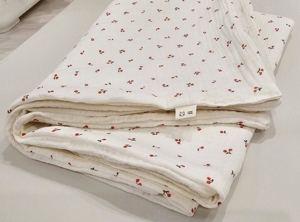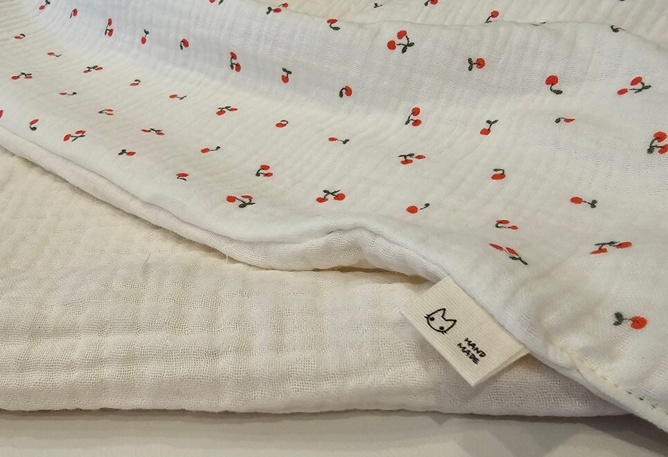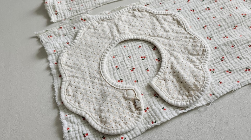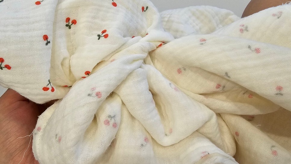 무지 거즈 원단 하나와 체리 모양의 거즈 원단을 덧댄 뒤,
