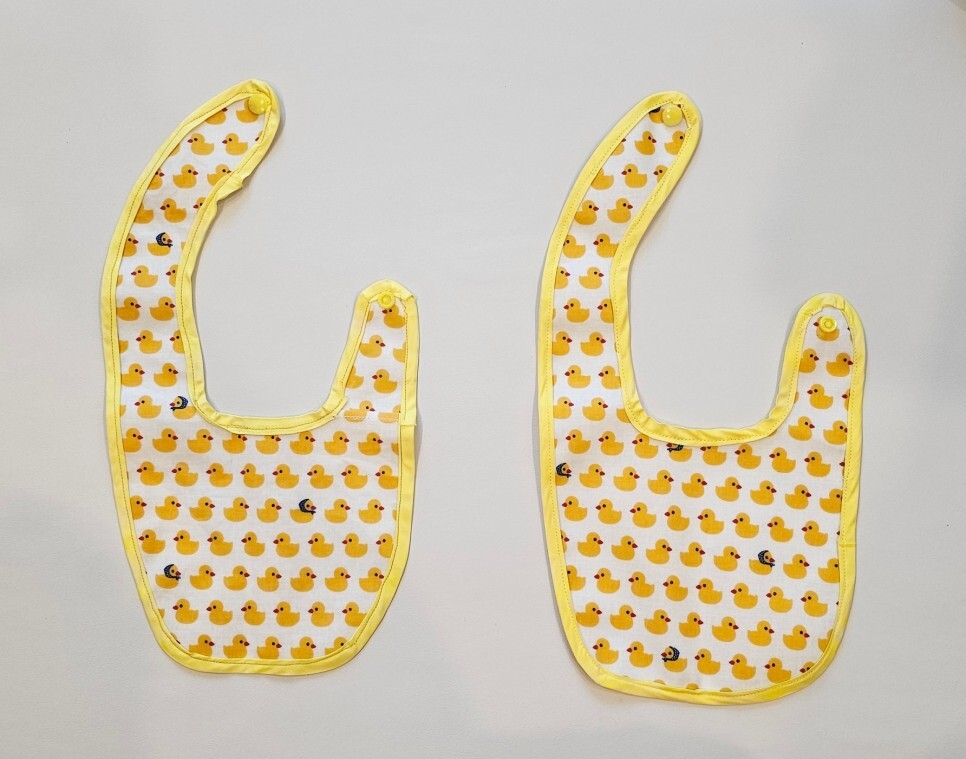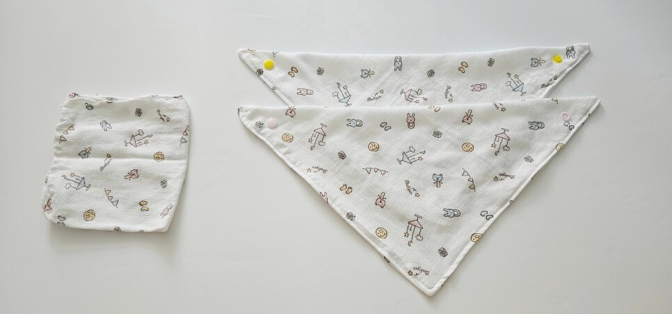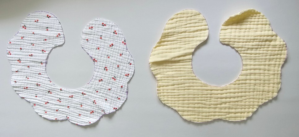 왼쪽이 젤 첨에 만든 턱받이고, 오른쪽이 어제 만든 턱받이다.