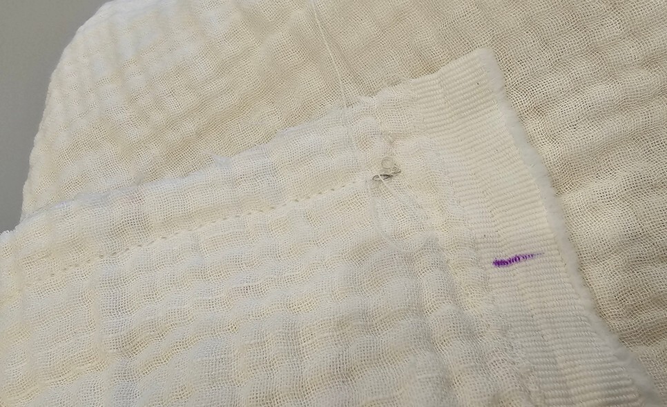 거즈 원단 2개를 재단하고, 겉면끼리 상침, 뒤집어서 창구멍만 상침해 마무리했다.