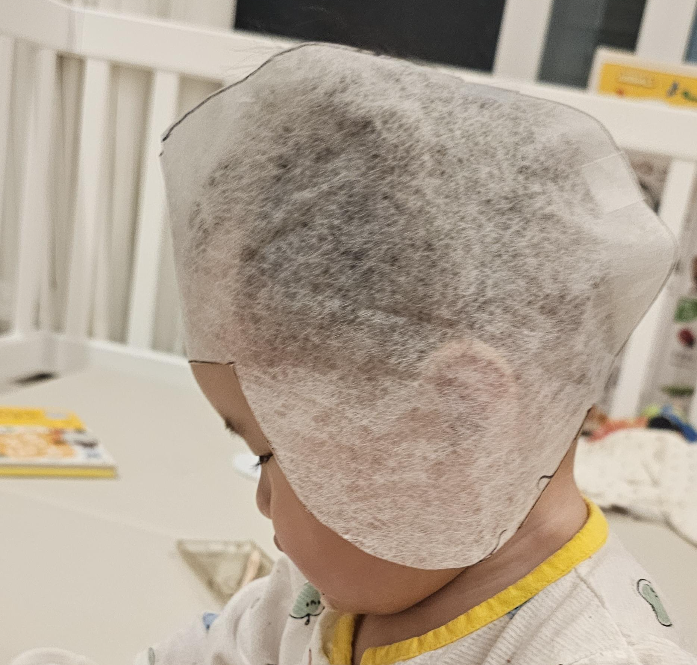 부직포로 그려서 아이 머리 사이즈에 맞게 셀프 제작했습니다.