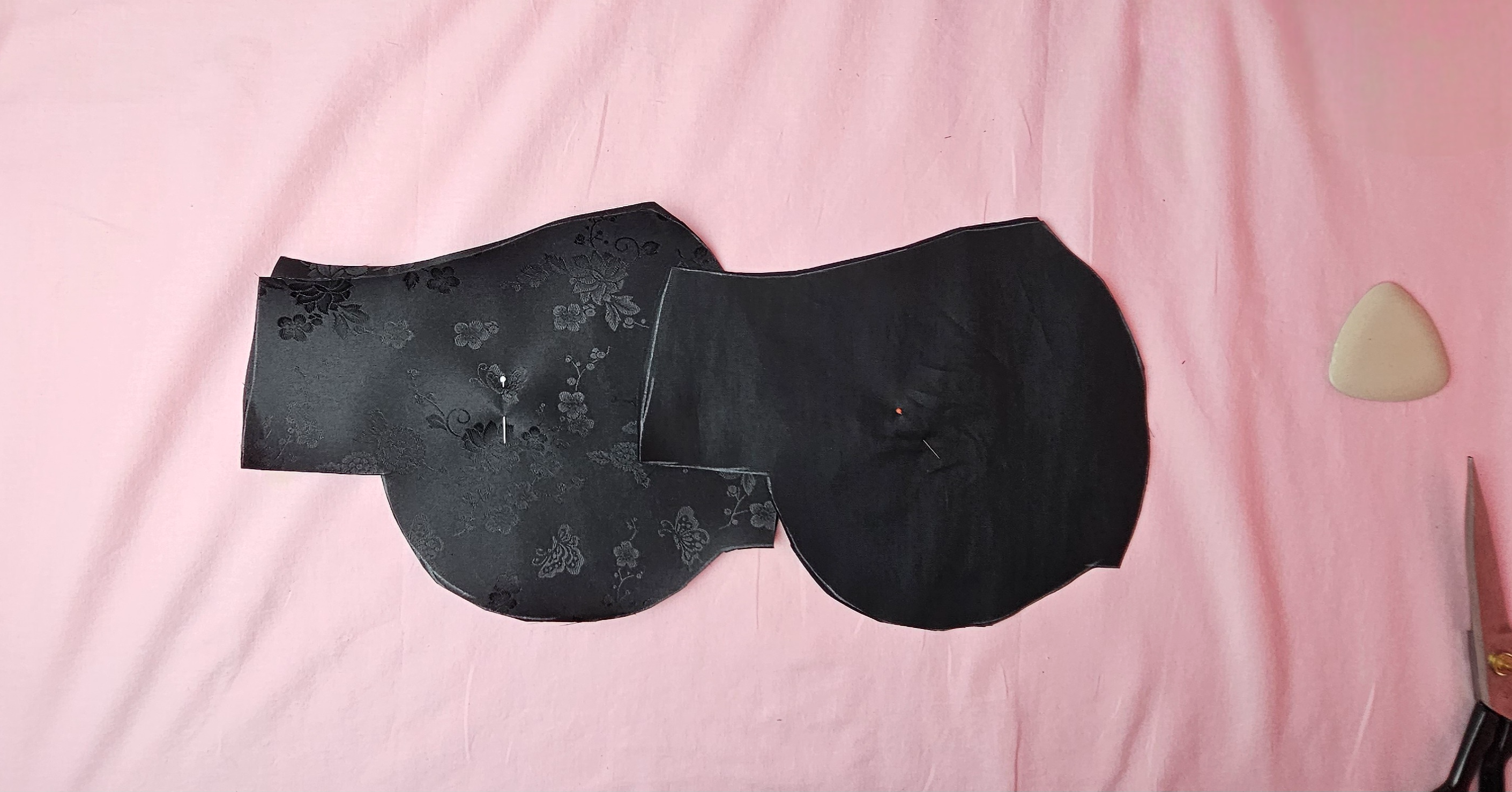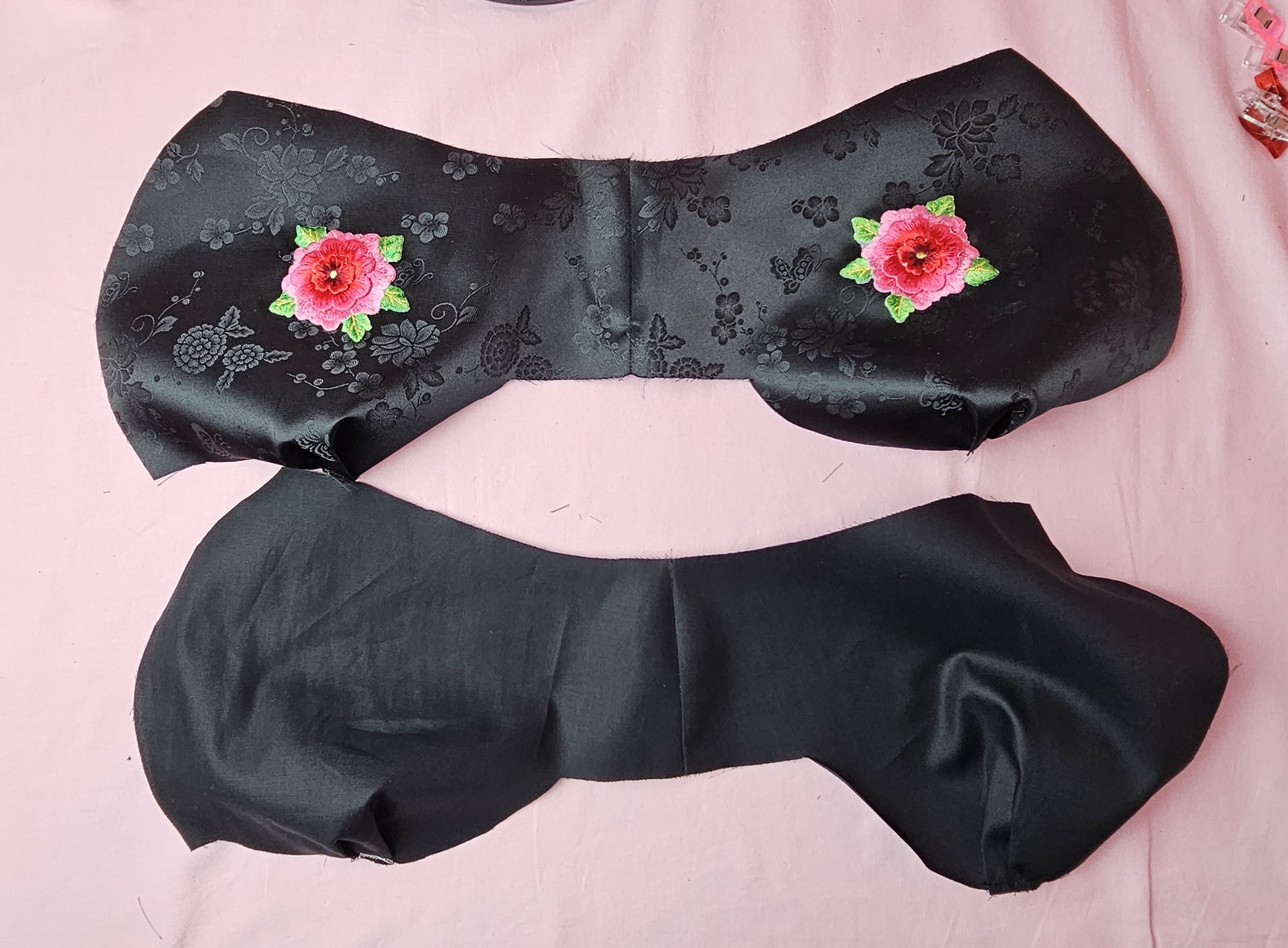 겉감을 안감과 합체 하기 전에, 투명실로 꽃과 꽃잎 부분을 둘러가며 열심히 바느질해줬습니다.자수 재봉한 부분이 안감 부분에 가려지니까, 감쪽 같겠죠! ^^