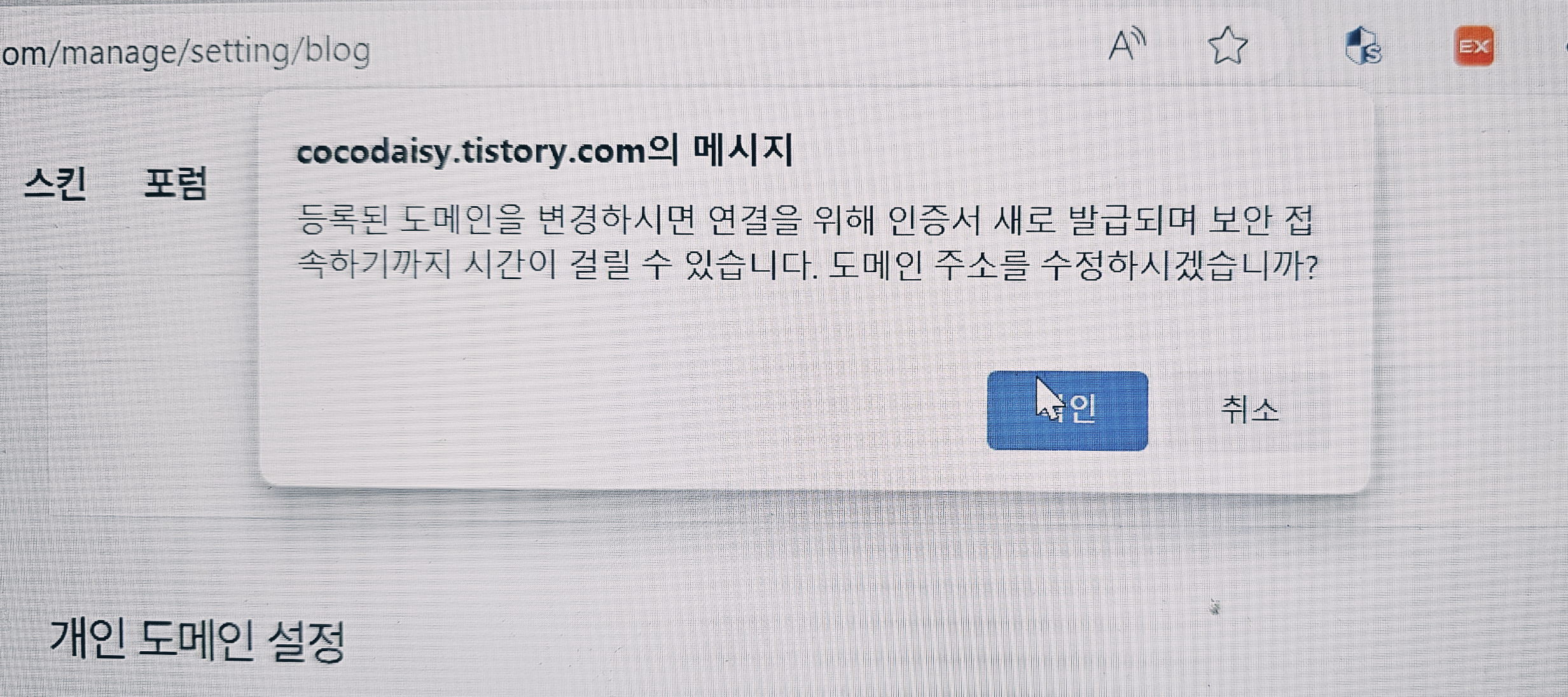 관리 - 블로그 - 개인도메인 설정 부분을 보니,